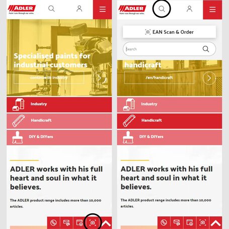 - Or by clicking on the search (the magnifying glass icon) in the white header menu. Above the search bar you will then find a button called "Scan & Order EAN", which will take you to the scanner app. (Figure 2)