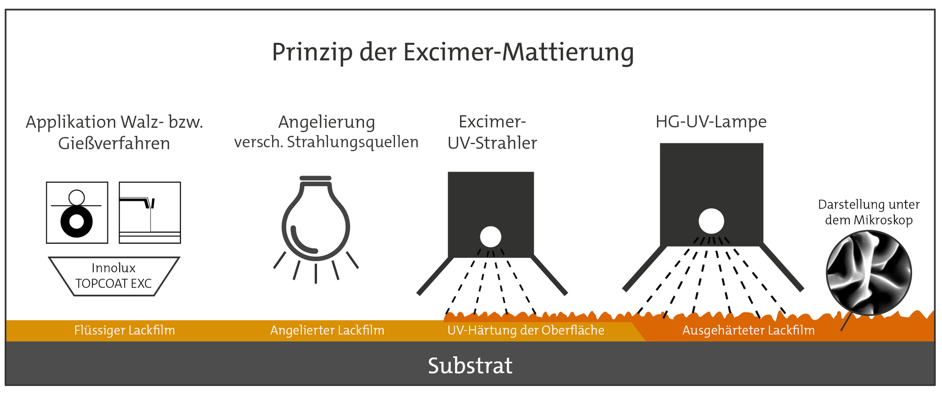 Bei dieser neuartigen Methode wird der im Walzverfahren aufgetragene, flüssige UV-härtende Excimer-Lack „Innolux Topcoat EXC“ unter Ausschluss von Sauerstoff mit kurzwelligem UV-Licht (172 nm) bestrahlt. Dies führt zu einer oberflächlichen Polymerisation, die eine Volumenschrumpfung bewirkt, welche sich wiederum in unterschiedlich starken Oberflächenfaltungen manifestiert. Diese verformte „Haut“ führt zu einer diffusen Reflexion des Lichts, die von uns als Matteffekt wahrgenommen wird. Zur vollständigen Aushärtung der Lackschicht erfolgt unmittelbar danach die Bestrahlung mit einem UV-Trockner.