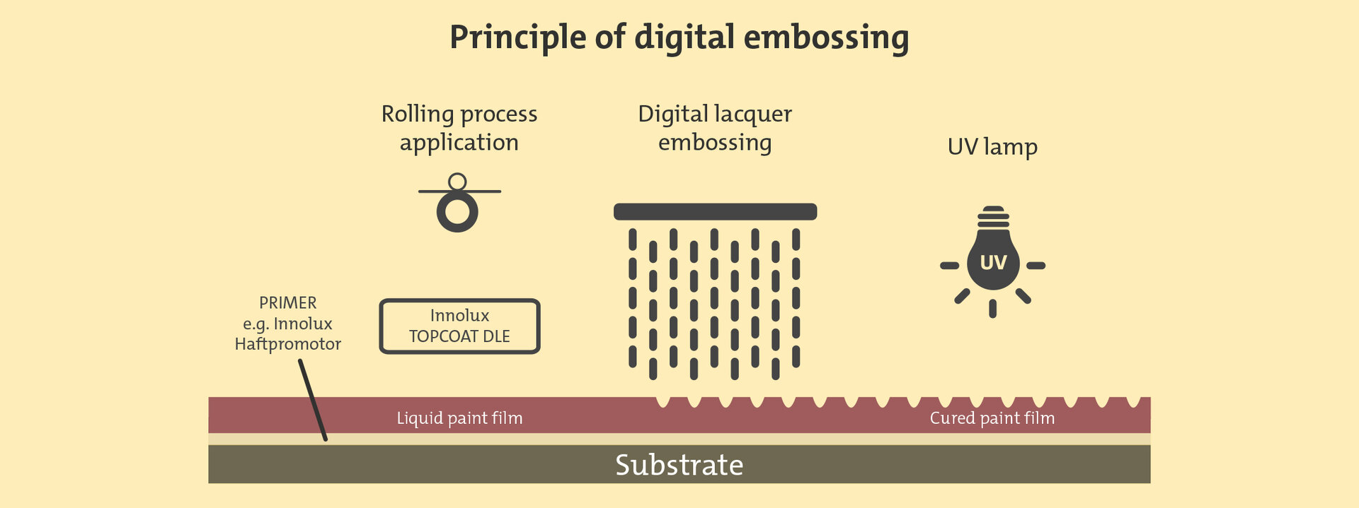 Digital Embossing innebär att ett transparent medium trycks i ett skikt av ej härdad UV-färg (Innolux TOPCOAT DLE). De fysikaliska och kemiska reaktionerna som utlöses ger en djup struktur.