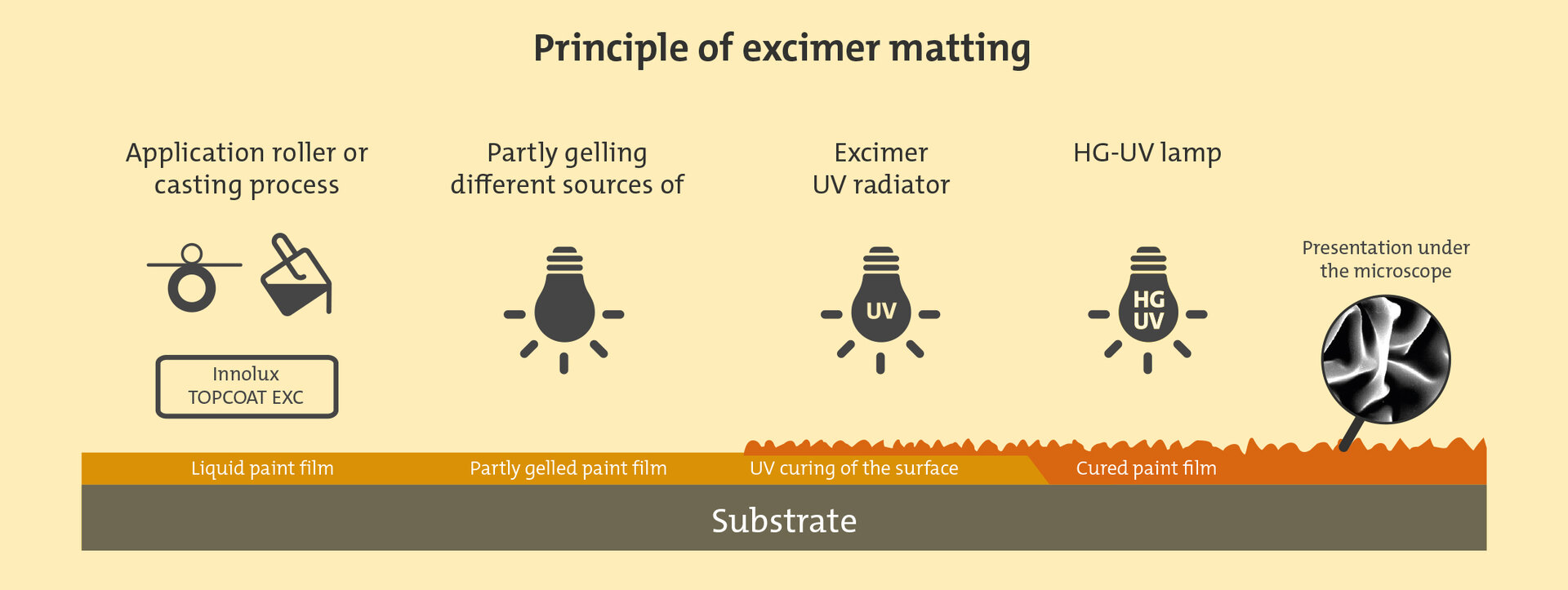 Med denna nya metod bestrålas den flytande UV-härdande excimer-färgen ”Innolux Topcoat EXC”, som har applicerats med valsmålning, med kortvågigt UV-ljus (172 nm) under uteslutande av syre. Detta ger en ytlig polymerisation som leder till krympt volym, vilket i sin tur resulterar i olika kraftiga veck på ytan. Denna deformerade ”hud” innebär att ljuset reflekteras diffust, som vi uppfattar som en matt effekt. För en fullständig härdningen av färgskiktet följer bestrålningen därefter med en UV-tork.